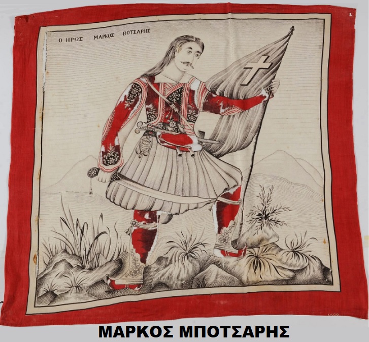 📸Ο Μάρκος Μπότσαρης αρβανιτόφωνος Έλληνας ένας από τους σπουδαιότερους αγωνιστές της Ελληνικής επανάστασης, τυπωμένη παράσταση σε βαμβακερό μαντίλι (ιστότυπο), 66 Χ 75,5 εκ. (12885). Εθνικό Ιστορικό Μουσείο.
